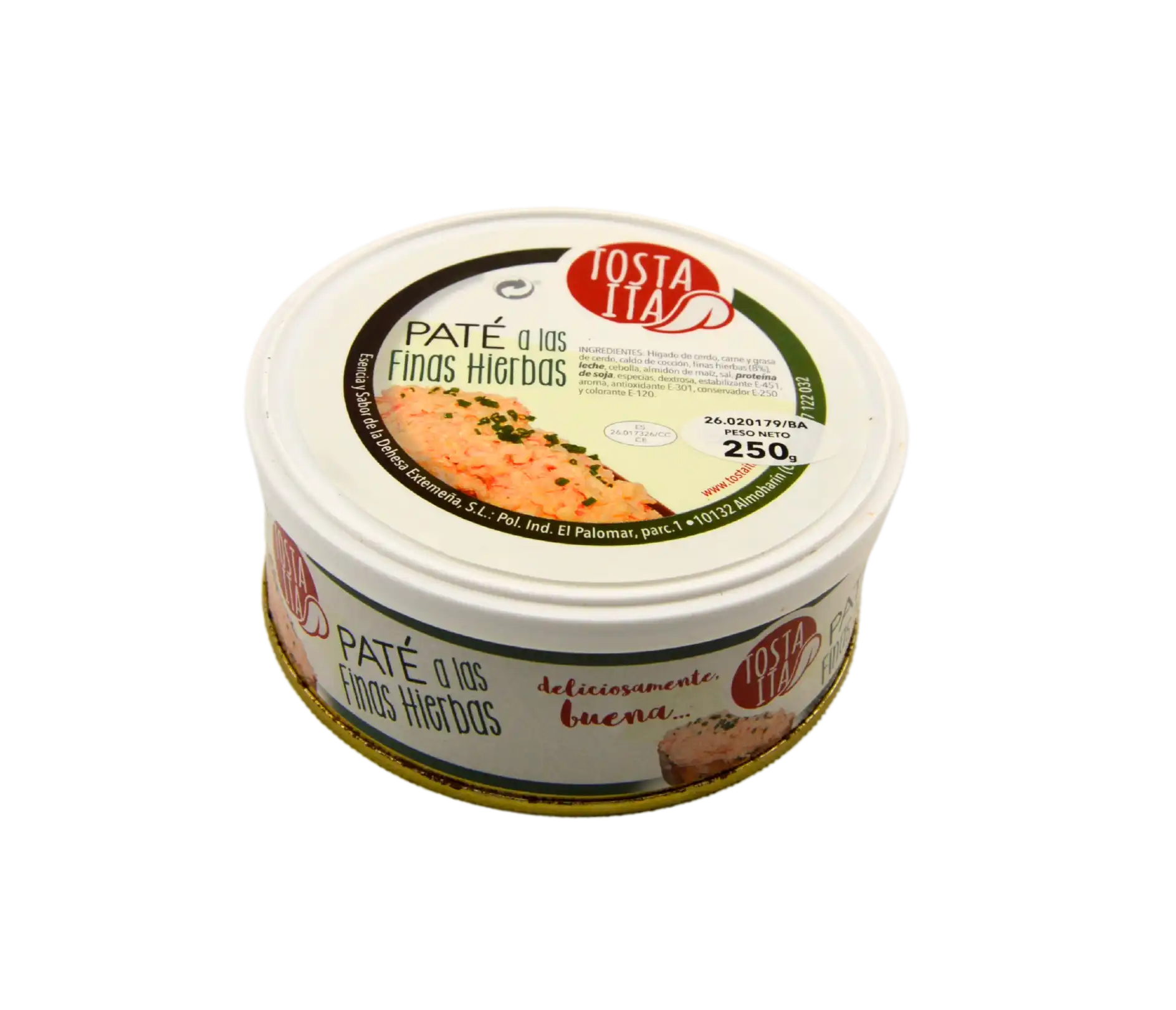 Ingredientes: Hígado y grasa de cerdo, agua, mezcla de plantas aromáticas 6%, preparado paté [almidón, sal, proteínas de soja, especias, dextrosa, estabilizante: fosfatos, aroma, antioxidante: ascorbato sódico, conservador: nitrito sódico y colorante: carmín], leche, cebolla frita (aceite de oliva virgen, sal y correctos de acidez: ácido cítrico),carne de cerdo aroma y estabilizante: CMC.